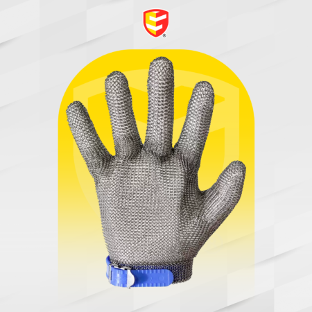 Guante de malla de acero resistente al corte con correa plástica altamente higiénicos, ideales para el manejo de alimentos.