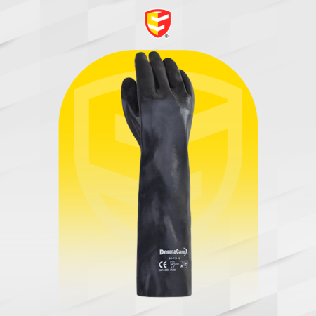 Guante negro con inmersión sencilla de pvc, de 18” pulgadas de largo, con forro interno de algodón, puño guantaleta, con inmersión sencilla de pvc negro, su acabado áspero mejora la manipulación de piezas húmedas o con presencia de grasas. El largo de su diseño de 18” pulgadas aumenta la protección del antebrazo.Excelente resistencia a químicos, cortes, abrasión y desgarre.